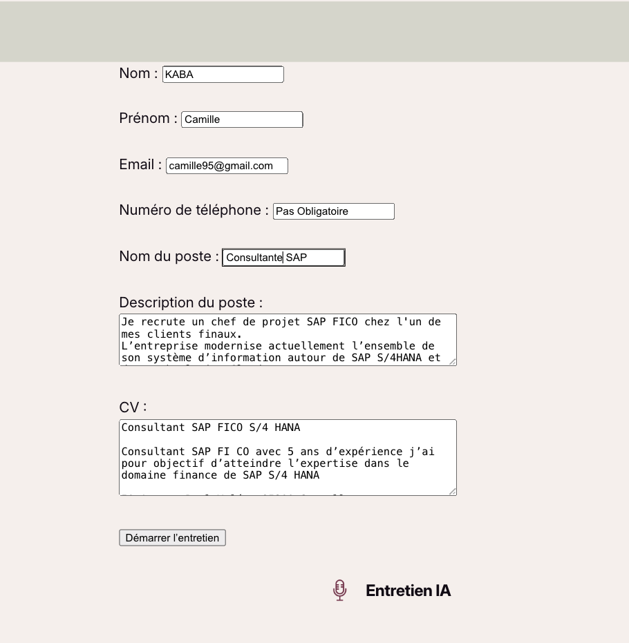 La première étape est que vous devez rentrer toutes les informations. Pour le CV et la description du poste il vous suffit de copier coller les informations de façon brute puis de cliquez sur commencer l’entretien comme vous allez le voir sur l’image ci dessous :
