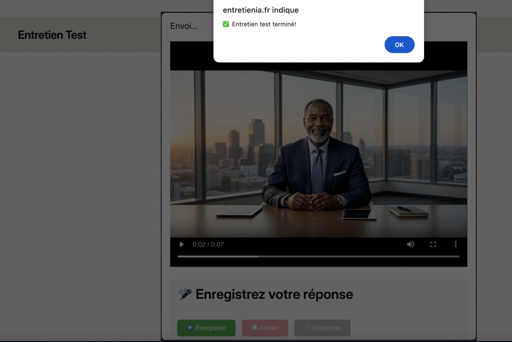 Une fois que vous avez appuyé sur Fin de l’entretien attendez de voir le message de confirmation que votre entretien est terminé et que votre feedback par email vous a bien été envoyé comme vous pouvez le voir ci-dessous :